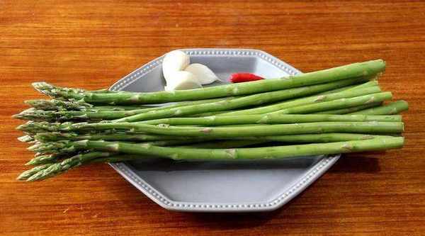 準備食材:蘆筍、大蒜、小米辣、生抽、鹽、糖