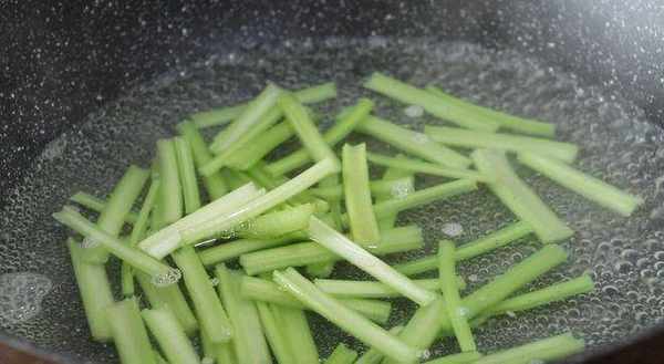 3、 鍋中加入適量的水,水開將芹菜焯一下水,撈出瀝幹水分;