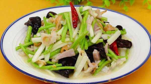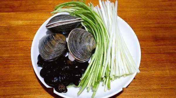 準備食材:天鵝蛋貝、蘆蒿、韭黃、木耳、幹紅椒、生薑、大蒜、