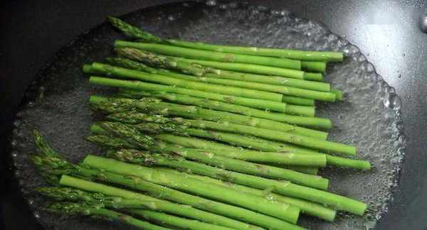 3、 鍋中加入適量的水,水開將鹽和油放入進去,將蘆筍放入進去焯一下水,這樣顏色會比較艷麗,不會暗沉;