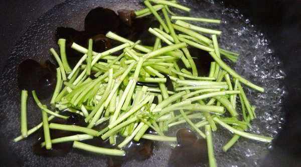 5、 接著放入韭黃翻炒幾下,再將蘆蒿和木耳倒入進去,加入一點點鹽入底味;