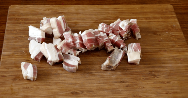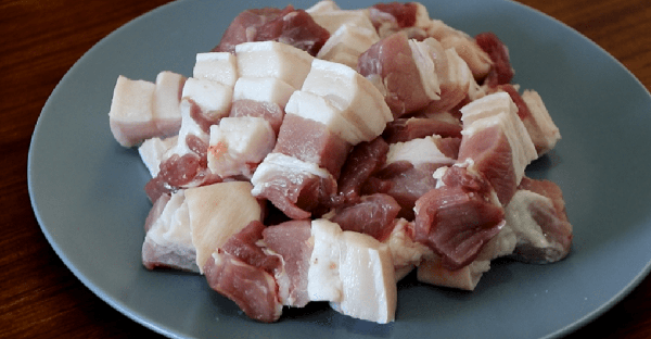 2、五花肉最好用水浸泡一下,刀刮一刮豬皮,然後切小塊。
