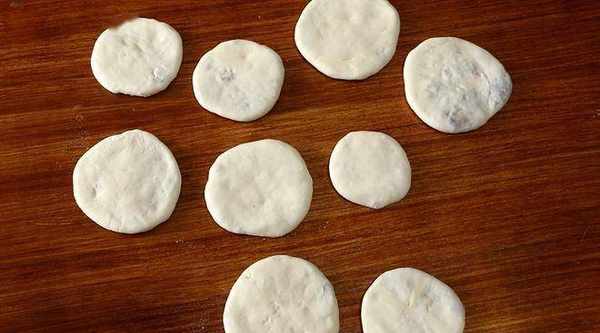 7、小面團壓扁,用搟面杖搟成面皮,中間包入梅幹菜和豬肉,封口處捏緊,再按壓扁。