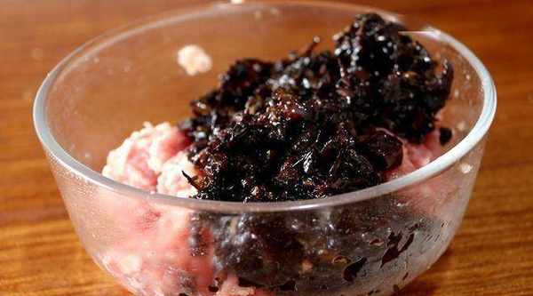5、將梅幹菜和肉末放一個碗中,拌勻。