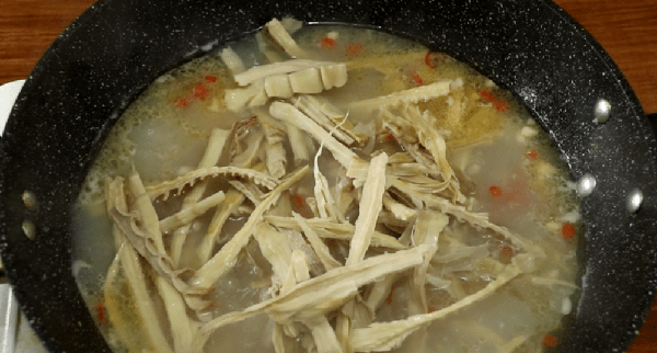 6、燉到水稍微變少,筍幹變熟,這時候就可以把茭白和粉條倒入砂鍋中燉煮。