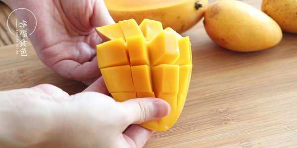 1、芒果切開打上花刀,取出果肉,嘴饞的可不要偷吃噢!