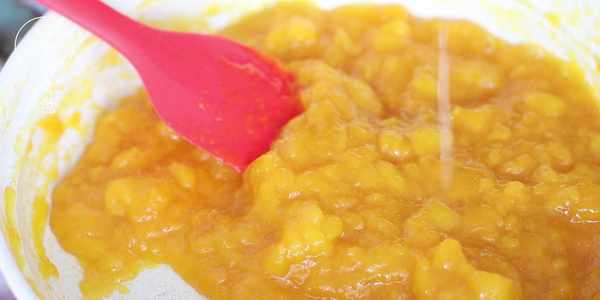 3、一邊翻炒一邊按壓,到果肉軟爛至黏稠的狀態,擠上適量檸檬汁翻拌均勻後關火。做好的芒果醬可以用來做芒果酥或者芒果雪糕。