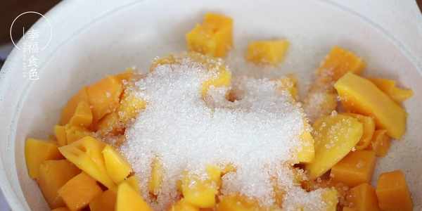 2、將芒果果肉和白砂糖倒入鍋中小火翻炒炒至白砂糖完全融化,水分會慢慢蒸發。