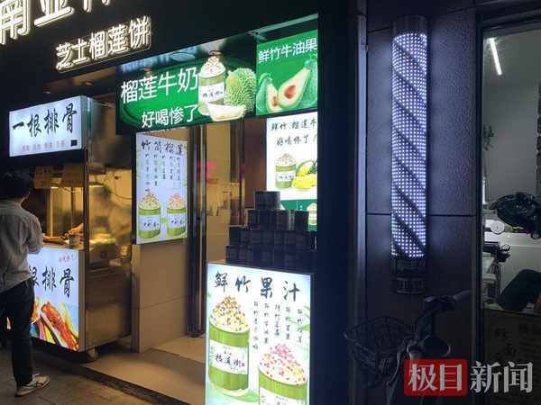 在另一傢店鋪內,竹筒內盛放的是果汁,有榴蓮、芒果、草莓、牛油果、摩卡咖啡等5種口味,售價也是25元。在1000米不到的美食街上,記者細數瞭共有5傢店鋪售賣竹筒茶,幾十米就能看到一傢。