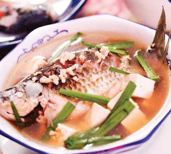 3 然後添入高湯,放入鯉魚、豆腐燒沸,加入精鹽、醬油,小火燒至汁濃,用水淀粉勾芡即可。