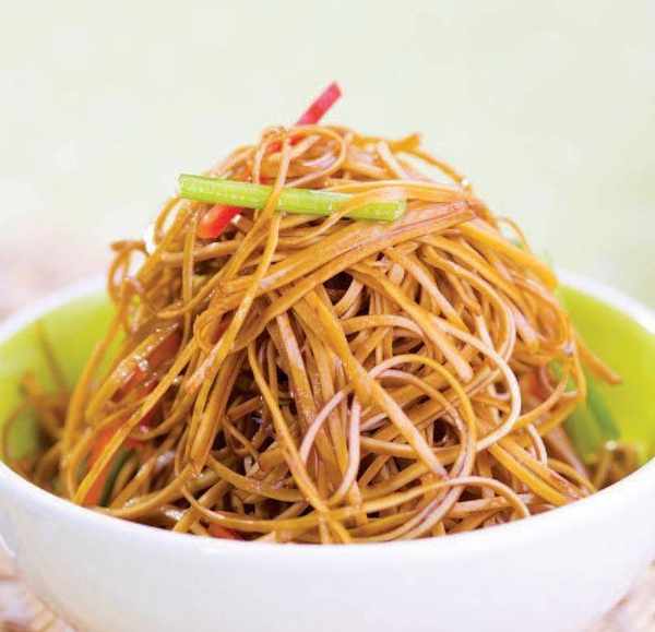 3 放入豆腐皮絲,烹入料酒、白醋,加入醬油、白糖、精鹽炒勻,添入少許清水,加入味精,用水淀粉勾芡,淋入明油,撒上蔥花即可。