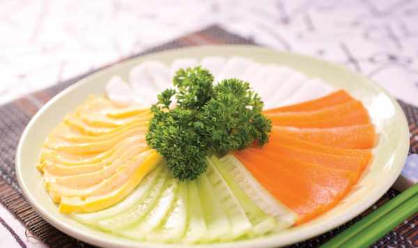 3 將蛋黃糕、蛋白糕、黃瓜片、胡蘿卜相間擺放於大盤中。