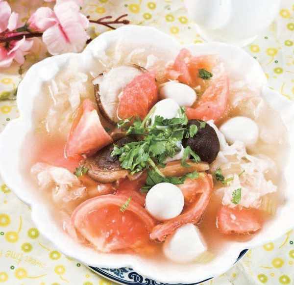 原料 西紅柿 150 克,鵪鶉蛋 100 克,水發銀耳 50 克,鮮蘑 30 克,香菜 10 克。