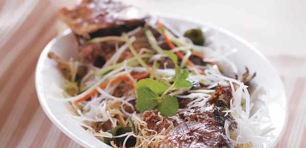 原料 凈鯽魚 1 條,涼粉 150 克,黃瓜絲、黃豆芽各 30 克,洋蔥塊、檸檬片、花生碎各少許。