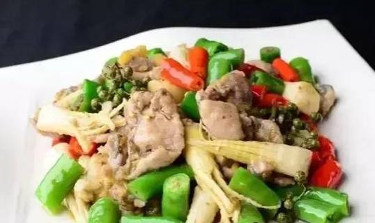 4.往鍋裡倒入油燒熱,投入薑片、蒜子和青花椒熗香,下雞脯肉條、筍子和青紅椒節翻炒,調入燒椒醬、鹽、味精和雞精炒勻,起鍋裝盤便好。