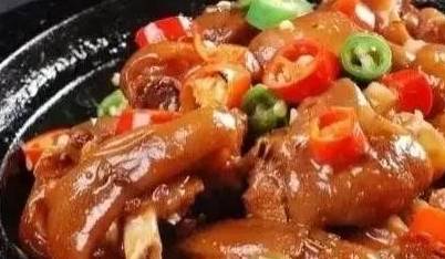 材料:豬手1隻,蒜薑片10克,八角桂皮,香葉適量,青紅椒丁20克。