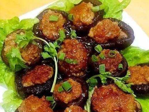 肉釀香菇食材:肉末、香菇、鹽、生粉、生抽、雞蛋、油、蔥花、生菜葉
