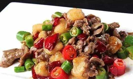 3.鍋留底油,下入青紅椒節、幹辣椒節、薑末和蒜末炒香,放入牛肉片,加鹽、雞精、味精、白糖、胡椒粉和保寧香醋調味,勾薄芡後淋少許香油,最後加放炸好的糍粑炒勻即成。