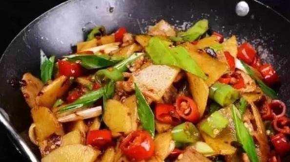此菜是把烏雞去骨,剁成條後加鮮筍、燒椒醬、鮮花椒同炒而成。