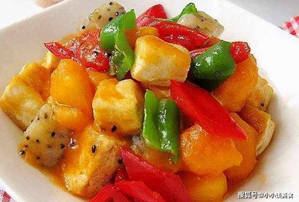 材料:木瓜、火龍果適量、紅辣椒1個、豆腐1塊、番茄醬2勺、鹽1勺、糖1勺、醋1勺、水淀粉2勺