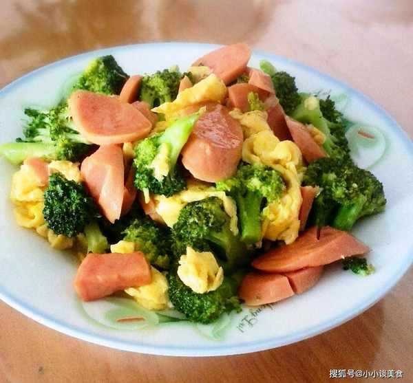 5、鍋裡倒油,倒入焯過水的西蘭花,再放入火腿腸,炒幾分鐘,加入蠔油和少許鹽,至西蘭花熟透,再加入雞蛋。最後加水淀粉稀釋醬汁,加入少許雞湯,即可食用。