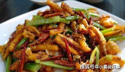 3、鍋中放入豬油燒熱,加入幹辣椒、花椒、薑絲翻炒片刻,然後同時翻炒魷魚,加鹽、味精、香菜、糖,攪拌均勻,裝盤。