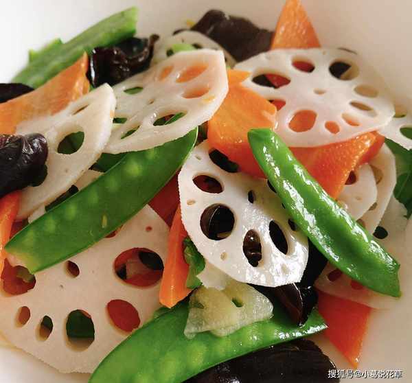 鍋中燒開水,加入適量的鹽和幾滴油,將荷蘭豆、胡蘿卜、藕片放入水中焯至爛,香菇焯水30秒。用冷水沖洗燙過的蔬菜並瀝幹。