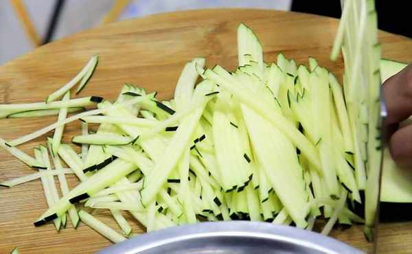 準備嫩南瓜一段,先把南瓜立著切成薄片再改刀切成粗細均勻的南瓜絲,放在盆中倒入清水浸泡五分鐘。