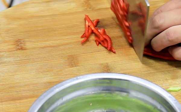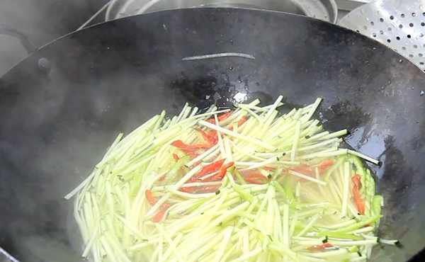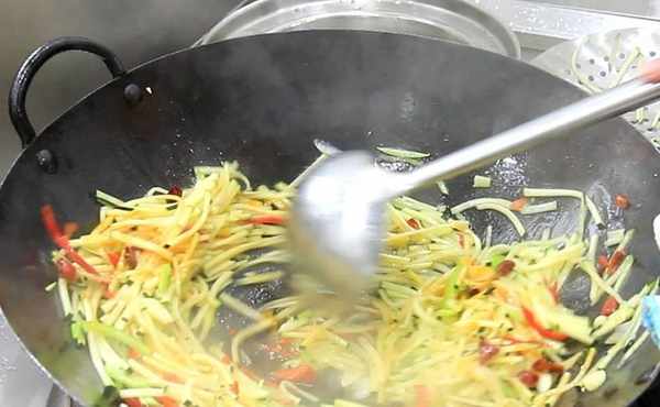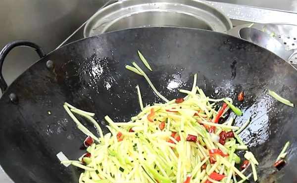 開始調味:放入食鹽2克(一勺),雞粉2克(一勺)翻炒化開調料以後,倒入白醋4克繼續翻炒,醋要早一點添加,醋可以使南瓜絲有脆脆的口感,淋入辣椒油5克,淋入辣椒油可以提亮南瓜絲的色澤,翻炒均勻以後即可出鍋裝盤。