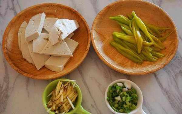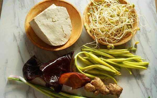 豆腐1塊、黃豆芽50g、水發木耳30g、黃花菜50g、老薑、蔥、鹽;