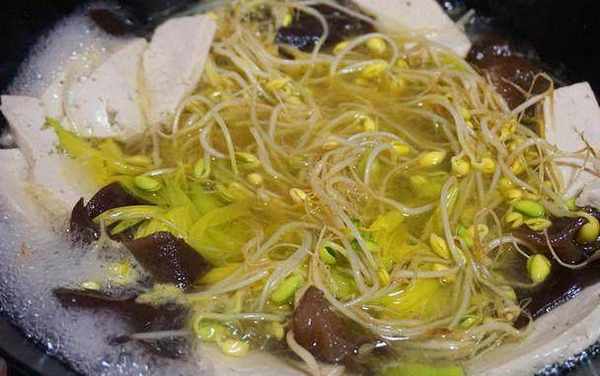 3.鍋內倒少量油燒熱後,下薑絲炒香,倒入適量清水煮沸後將豆腐、黑木耳、黃花菜、黃豆芽按照煮熟時間長短分別下入鍋中;
