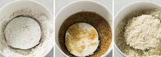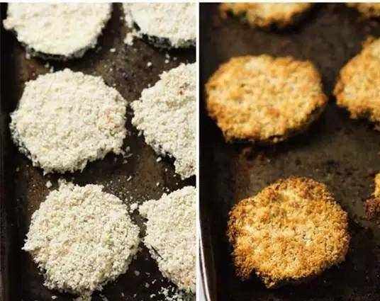 步驟二:將裹過蛋液的茄子片取出現在面粉中裹一次,再過上芝麻和面包糠,傢裡沒有面包糠也沒關系哦。
