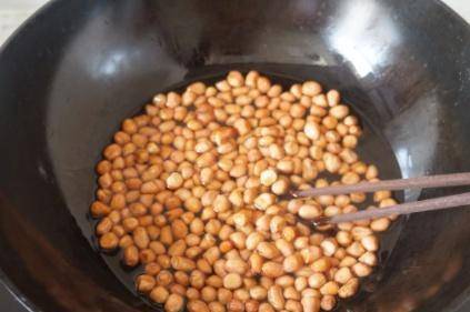 緊接著我們再準備一口油鍋,鍋裡面先不要著急放油,首先需要把鍋進行燒熱,等到鍋燒熱瞭之後裡面也沒有水分,這個時候就可以把浸泡過的花生米放在油鍋裡面關成小火,先進行煸炒,這樣的話就可以把花生米裡面的水分完全去除掉瞭,因為花生米清洗過之後還是有一些吃的,如果直接放在油鍋裡面炸的話,不但會影響花生米的口感,而且也是會出現砰砰的聲音,所以我們先把花生米裡面的水分全部炒幹之後,再加入適量的油開始油炸花生。