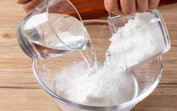 1、準備兩隻同樣大小的碗,一個裡面加上豌豆淀粉,然後再往裡面倒入同等量的清水,用筷子充分攪拌,直至細膩無顆粒。