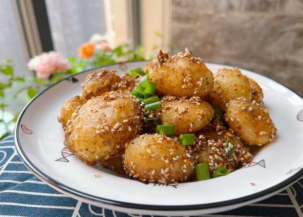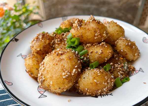 小土豆500克、孜然粉、辣椒粉、花椒粉、白芝麻、食用鹽、香蔥、食用油少許