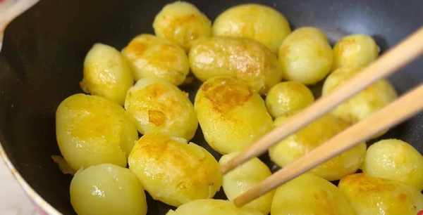 6、平底鍋內放入少許的食用油,將土豆放入鍋中煎。