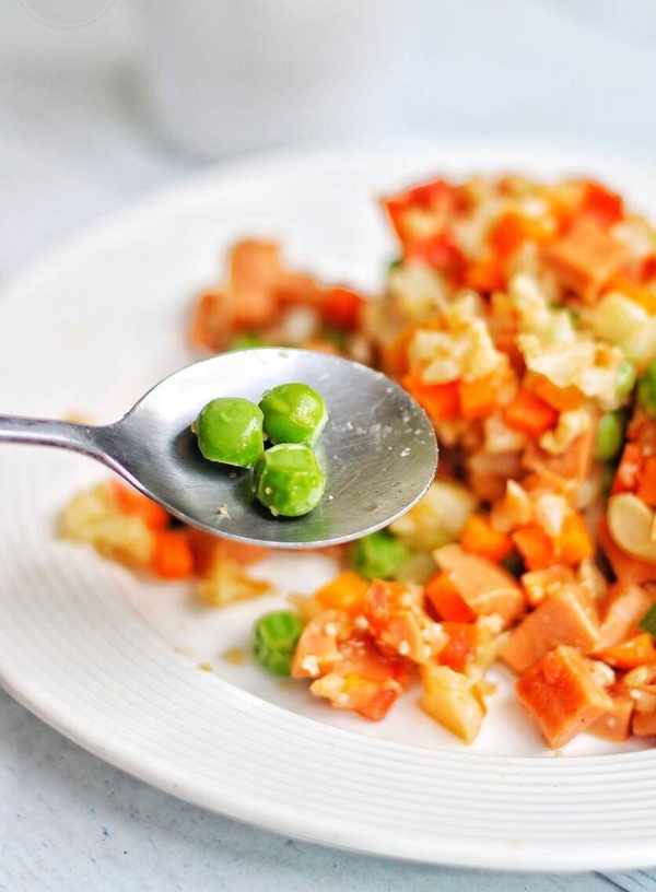 2、老豆腐、豌豆、玉米粒、胡蘿卜丁絲蔬菜搭配在一起,解饞飽腹的同時,也可能會有米飯類似的口感,同時也要做好控制好食用油的使用量和食鹽的使用量。