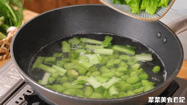 3.煮一鍋沸水,加入少許油和鹽,將蠶豆和瓢兒菜梗焯燙1分鐘,再加入菜葉燙30秒,撈起瀝幹