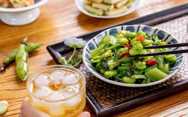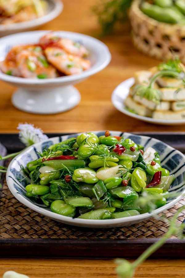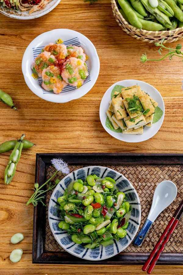 不過半個鐘頭,瓢兒菜茴香炒蠶豆、茴香豆腐、蠶豆蝦餅便一一登場。
