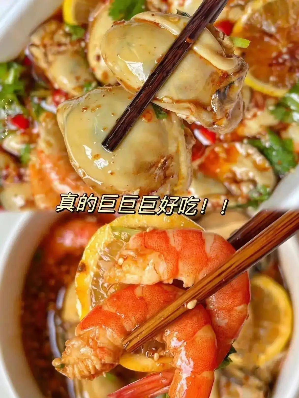 3、最後是把撈汁均勻地淋在海鮮的上面,攪拌均勻就可以直接吃瞭。如果是人少的話可以多種海鮮份量減少,這樣吃起來更過癮,比如白貝,魷魚等等。