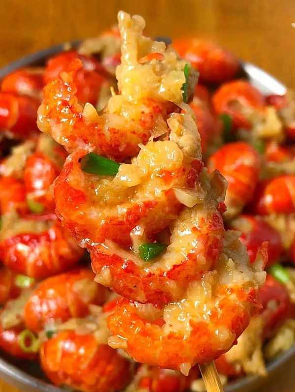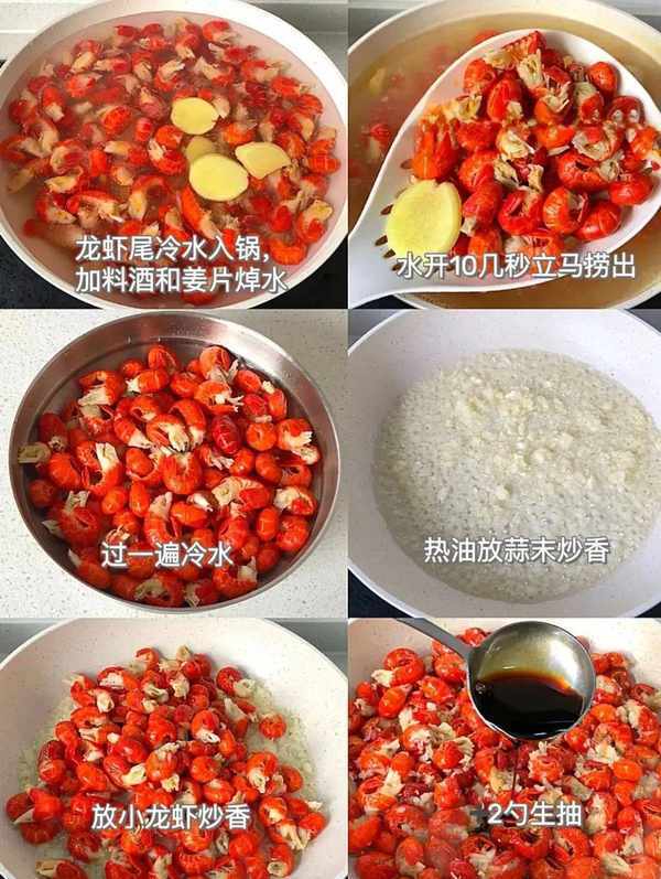 2、起鍋燒油爆香蒜末,放入小龍蝦尾炒散開來,加入2勺生抽,1勺蠔油,少許的鹽,白糖和胡椒粉,快速翻炒均勻。