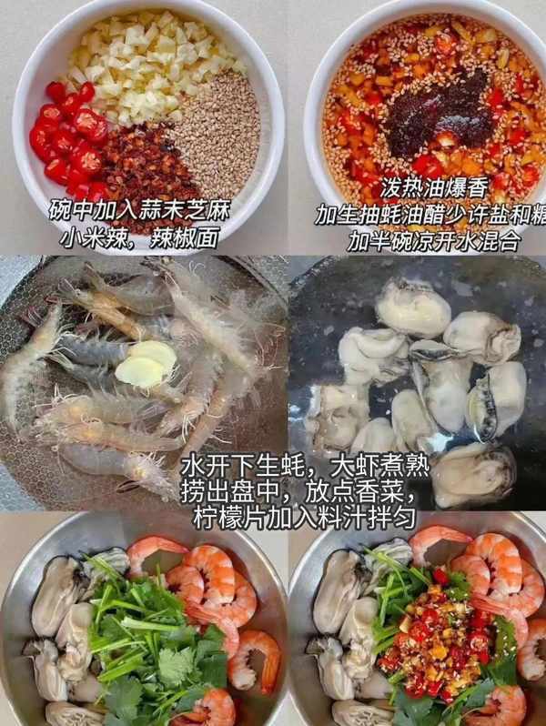主要食材:大蝦,生蠔,白芝麻,蒜末,小米辣,洋蔥,香菜,辣椒粉,檸檬片,蠔油,生抽,醋,鹽,白糖。這一份撈汁小海鮮,人多的時候可以加大份量增加海鮮品種,用同樣一種撈汁,人多人少都可以應對,十分愜意。