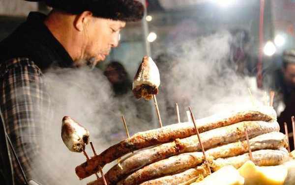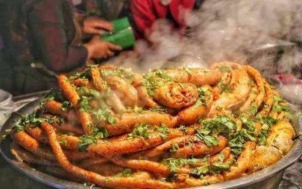 剛看到這種小吃的時候,遠遠看上去就像是我們平時吃到的手工香腸一樣,而且一圈一圈的特別的長老遠,看起來就特別的有食欲,大叔在做這種小吃的時候,出光聞味道就讓人口水都要流下來瞭,而且看得出這種香腸外面也是烤的特別香,而且還放瞭一些蔥花,香菜很清楚的,就可以看見裡面有很多的肉列,對於愛吃香腸的人來說真的是無法自拔的。