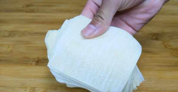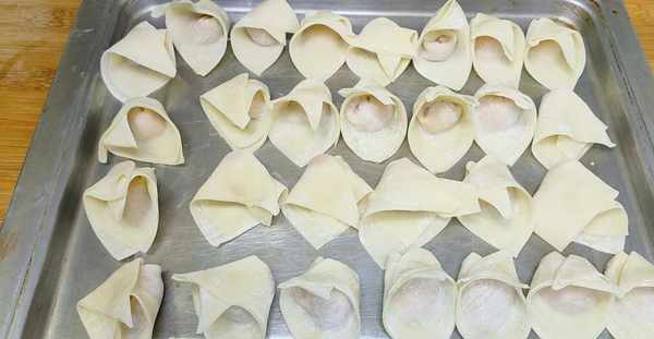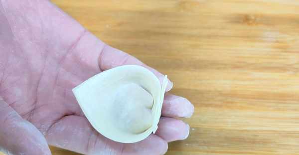 下面準備一些餛飩皮,如果買不到也可以自己來搟,先使用小勺子取上一點肉餡,放在餛飩皮的中間,然後在用手指蘸一點水,塗抹在餛飩皮的邊緣,接著在對角對折,把邊緣按實一下,這樣更容易黏合不露餡,然後在調一個面,兩個邊角在塗抹一點水,接下來在將兩角粘連按實一下,輕輕的按一下就可以瞭,這麼一個元寶餛飩就做好瞭,10秒鐘一個,非常的簡單快速。餛飩包好之後先放入一個幹燥的盤子裡面,