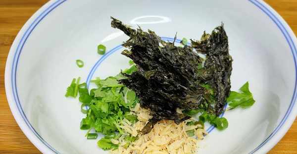 下面兌一個湯料,準備兩根小蔥,切成蔥花,切好之後放入大碗中,香菜在來兩三根,切成小段,如果不喜歡吃香菜的朋友,也可以忽略這一步,切好之後放入大碗裡面。加入少許食鹽、少許雞精、不喜歡可不放,一點生抽醬油,在加入一點蝦皮,紫菜在加入一點,