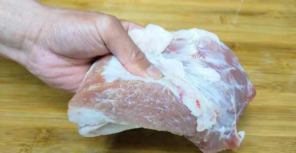首先準備一塊大約300克左右的前夾肉,做餛飩選用這個部位的肉,吃起來比較嫩,口感也是很好的,然後先把肉改下刀,先切成薄一點的片,盡量切的薄一些,這樣也方便下一步的操作,接著在剁成肉末,如果不喜歡手工來剁,也可以使用絞肉機來處理一下,但是我認為還是手工剁處理的肉餡吃起來會更香,口感也會筋道,大概剁成像這樣的程度就可以瞭,下面先把肉餡放入一個大碗裡面,下面來調個味,加入半勺食鹽、半勺雞精、一點點胡椒粉、一點料酒去腥,一點生抽醬油、最後在加入一點蔥薑水,不需要多,隻需要一點點就可以瞭,下面使用勺子攪拌一下,把裡面的調料都攪拌均勻,一直把蔥薑水都吃進肉餡裡面去,這樣調出來的肉餡鮮香又滑嫩,吃起來也沒有腥味,一直把肉餡調到這樣發粘拉絲的狀態就可以瞭,先放一旁醃制10分鐘。