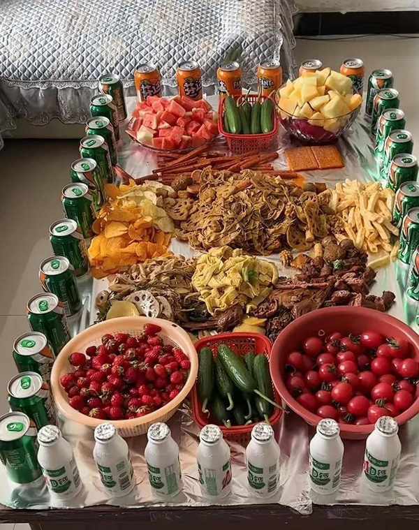 最近,一位河南女士曬出瞭充滿儀式感的聚餐圖,聚餐地點在傢裡,隻見美味的食物直接倒在錫紙上占滿瞭整整一張茶幾。整齊排列的罐裝飲料,西瓜、哈密瓜、草莓等各種水果,加上辣條和各種鹵味,豐富極瞭,看著直流口水。