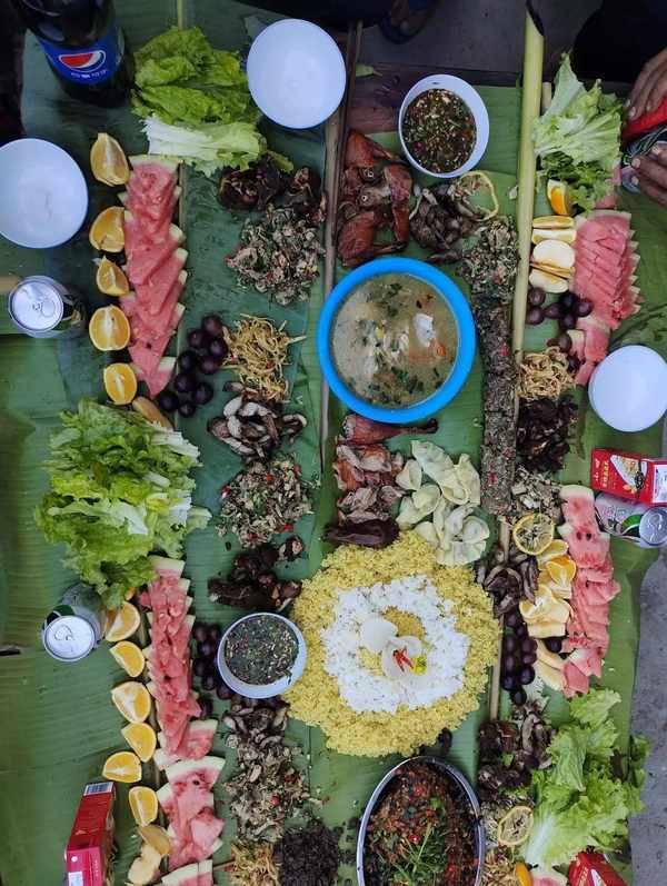 江西網友曬出來的野餐圖,真是物盡其用,用天然的植物芭蕉葉做餐佈,上面擺滿瞭各種水果、鹵味和主食。分攤均勻,看起來有點像是茶話會,大傢聚在一起,吃吃喝喝拉拉傢常件真是很美好的一件事。