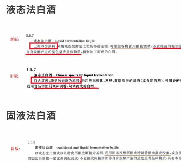 大傢看圖,區別太明顯瞭:首先,所用的原材料,原來是薯類、糖類物質,新國標強制規定,必須用谷物類的原材料,也就是說必須要用高粱、小麥、豌豆之類的谷物;最關鍵的地方大傢看到瞭嗎?那就是不能添加各種“香味物質”,什麼意思?就是不能再添加香精瞭。