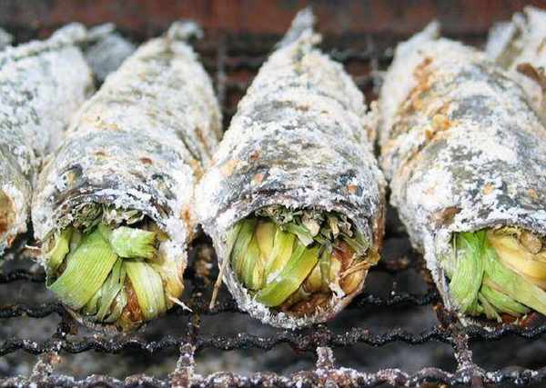 單看圖片,愣是看半天沒看出來是什麼,還以為裡面塞的東西可以吃呢!原來這是魚,是泰國曼谷的檸檬草烤魚,魚肚子裡塞滿瞭檸檬草、香茅和其他香草,再在魚的表面鋪上一層鹽,經過炭烤後,魚肉的肉質依然不會幹,沾上特制醬料,非常不一樣的味道。烤熟後香味四溢。